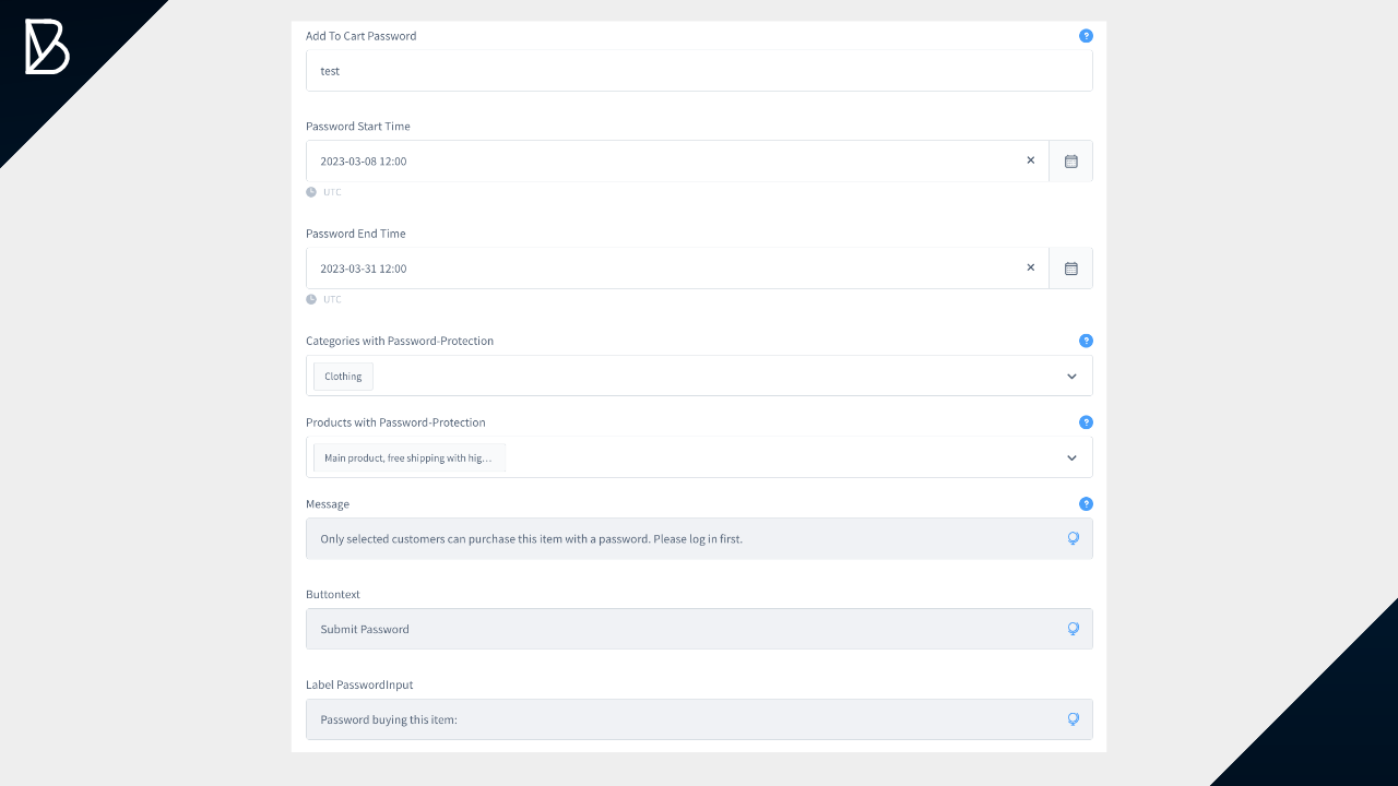 B2B Pro also provides the ability to protect the "Add to Cart" button with a password. This allows you to offer special deals only to selected customers. You can restrict the protection to specific categories and products, as well as set a start and end time for the password.