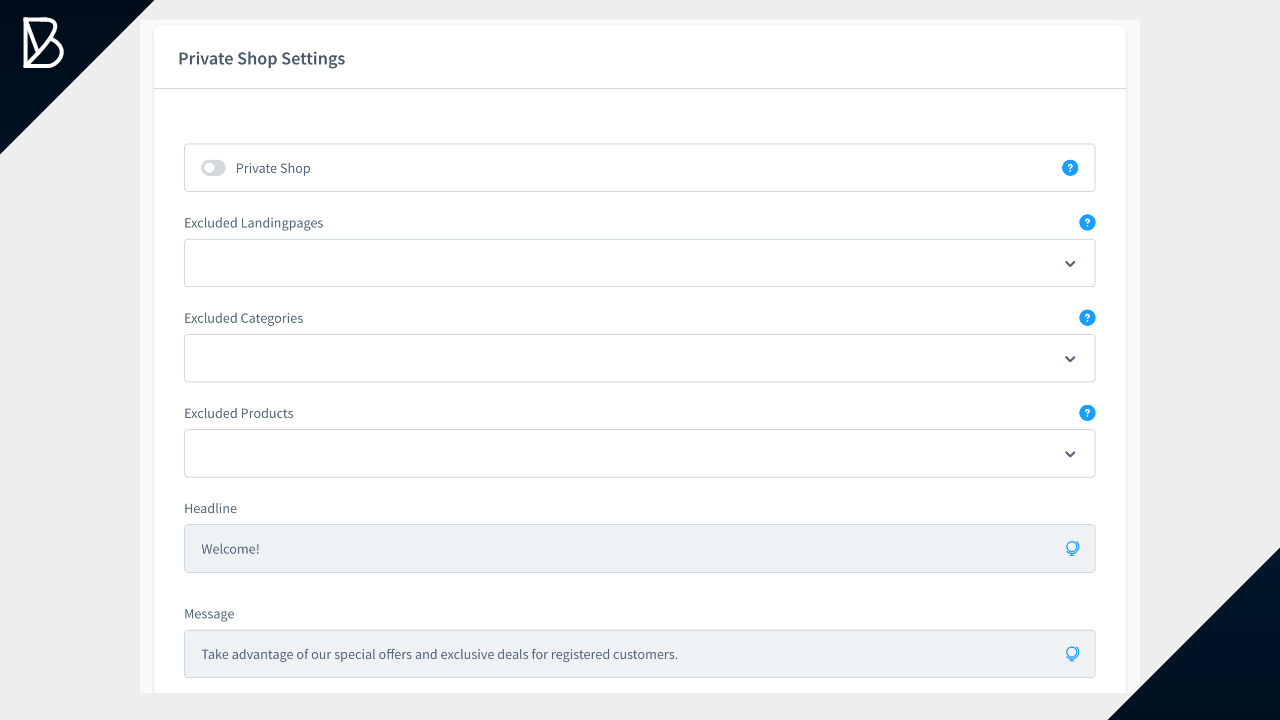 If you run a private shop, B2B Pro allows you to restrict access to logged-in customers. You can exclude specific landing pages, categories, and products from the private shop. Additionally, you can set your own headline and message for the private shop.